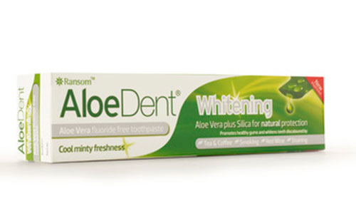 Η Aloe Dent Whitening Toothpaste περιέχει μαλακτικό ζελέ φυσικής αλόης με ανακουφιστική δράση, πράσινο τσάι – κατά των βακτηρίων, έλαιο τεϊόδεντρου για αντισηπτική δράση, συνένζυμο Q10 για υγιή ούλα, πυρίτιο για φυσική λεύκανση των δοντιών και μενθόλη για φυσική γεύση μέντας. Παράλληλα δεν περιέχει φθόριο.