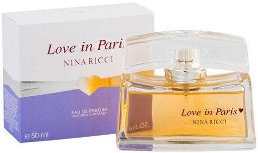 Το Love in Paris από την Nina Ricci είναι ένα λουλουδένιο άρωμα για γυναίκες. Οι νότες κορυφής είναι παιώνια, ροδάκινο, αστεροειδής γλυκάνισος, μπανάνα, αχλάδι, περγαμόντο και τριαντάφυλλο. Οι μεσαίες νότες είναι βερίκοκο, βιολέτα, γιασεμί και γλυκάνισο. Οι νότες της βάσης είναι μόσχος και νότες ξύλων.