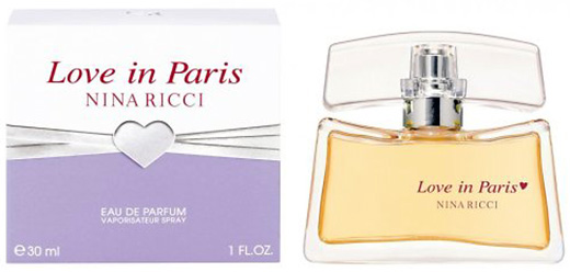 Το Love in Paris από την Nina Ricci είναι ένα λουλουδένιο άρωμα για γυναίκες. Οι νότες κορυφής είναι παιώνια, ροδάκινο, αστεροειδής γλυκάνισος, μπανάνα, αχλάδι, περγαμόντο και τριαντάφυλλο. Οι μεσαίες νότες είναι βερίκοκο, βιολέτα, γιασεμί και γλυκάνισο. Οι νότες της βάσης είναι μόσχος και νότες ξύλων.